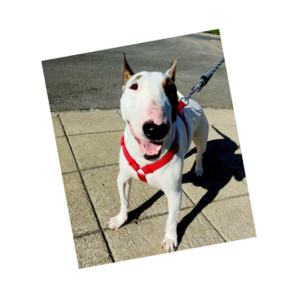 Bull Terrier (Fêmea), com 7 anos esterilizada; peso - 28-30kg; teve fratura na perna quando tinha apenas 2 meses - , foi no entanto devidamente tratada; tem pele atópica (não é contagioso nem grave) - recomenda-se ração específica para tal (+/- 20/30€ de ração mensal) e apanhar sol.